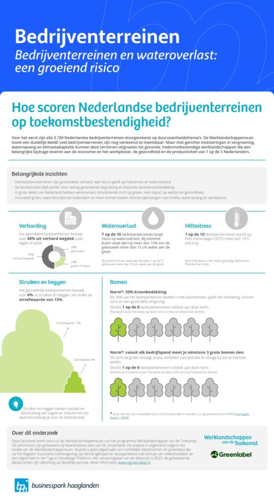 Voor ondernemers en vastgoedeigenaren is dit geen ver-van-mijn-bed-show. Bijnaย ๐ฒ๐ฒ๐ป ๐ฑ๐ฒ๐ฟ๐ฑ๐ฒ ๐๐ฎ๐ป ๐๐ฒ๐ฟ๐ธ๐ฒ๐ป๐ฑ ๐ก๐ฒ๐ฑ๐ฒ๐ฟ๐น๐ฎ๐ป๐ฑ bevindt zich dagelijks op deze locaties. Tegelijkertijd bestaat een gemiddeld terrein voor bijna de helft uit verhard oppervlak, wat wateroverlast en hittestress versterkt.